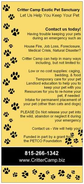AGENCIES! Let us help your clients keep and/or care for their pets Critter Camp Exotic Pet Sanctuary Critter Camp Exotic Pet Sanctuary is partnering with area agencies to help people keep their pets during the current economic hardships, or whenever emergencies or natural disasters might arise. When people seek out your services during a crisis, whether it is a job loss, home foreclosure, a natural disaster, etc., they will often have a loved pet that will need support and resources. All too often these pets are left at animal shelters or released to fend for themselves simply because the owners felt they had no other options. The staff of Critter Camp is taking the initiative during these harsh economic times to help those people in need that desire to keep their pets, or at least provide peace of mind if their pet requires re-homing or shelter care. Our goal is to help with low cost or free supplies; temporary placement for exotic pets at our facility; education to landlords to help displaced pets; and resources to re-home the pets, when necessary. Critter Camp has made the commitment to care for local exotic pets in need. We are not licensed to care for cats and dogs. We also unable to accept wildlife or the larger exotics. We can help with pets such as ferrets, hedgehogs, rabbits, hamsters, birds, lizards, and many more. We would like to invite your agency to enter into a cooperative agreement with Critter Camp Exotic Pet Sanctuary. We hope that you will agree to inform your clients about our ability to provide resources and alternatives for their pets when they are in need. In return, we will post a link on our emergency page acknowledging your cooperation, and we will agree to partner with your agency in any way we can, as well. Please visit our website http://www.crittercamp.biz and see our Emergency Page for details. Feel free to contact us at any time, and to forward this message to other agencies. To partner with Critter Camp, simply reply by phone or email stating that you agree to work together with us on this much needed issue. Please provide a contact name, address, phone, and email. Thank you, Beth Randall Director, Critter Camp Exotic Pet Sanctuary beth@crittercamp.biz 815-266-1342 |