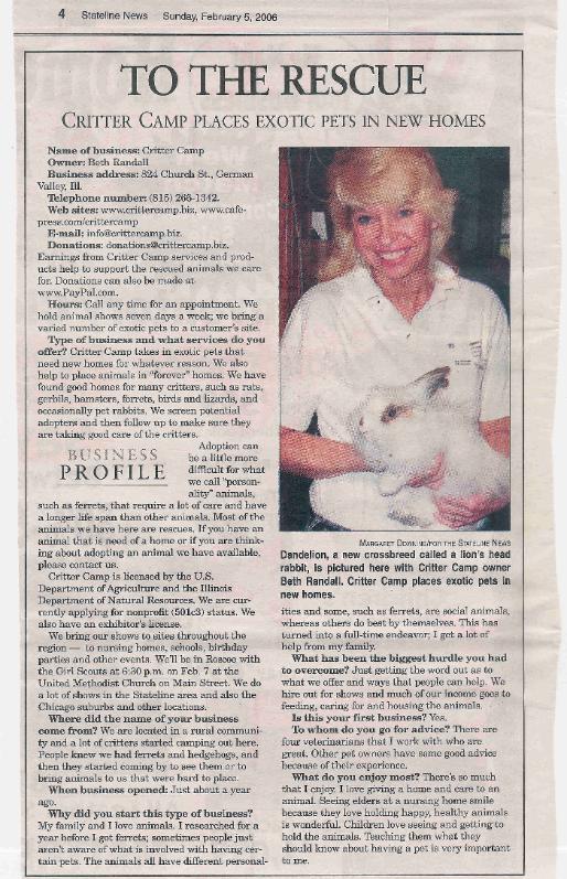 Exotic care: Critter Camp in German Valley moves forward - Freeport, IL - The Journal-Standard 12/09 |